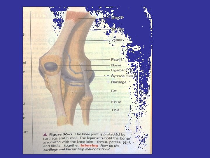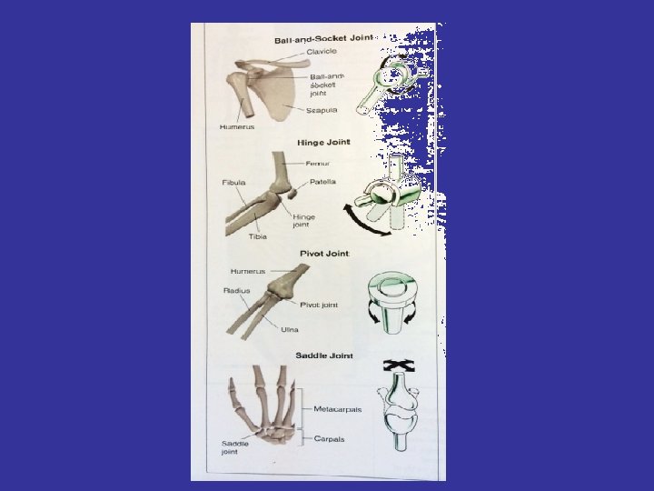 Joints – 2 bones come together. Held together by ligaments. Cushioned by cartilage. Lubricated by synovial fluid • Types of joints: – Ball-and-socket shoulder & hip