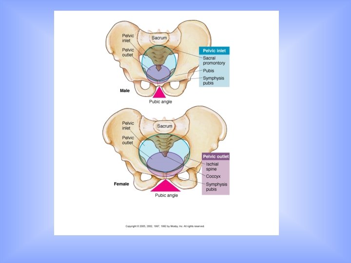 Differences Between a Male and Female Skeleton • Size difference: male skeleton is generally larger • Shape of pelvis: male pelvis is deep and narrow, female pelvis is broad and shallow • Size of pelvic inlet: female pelvic inlet is generally wider, normally large enough for baby’s head to pass through • Pubic angle: angle between pubic bones of female is generally wider
