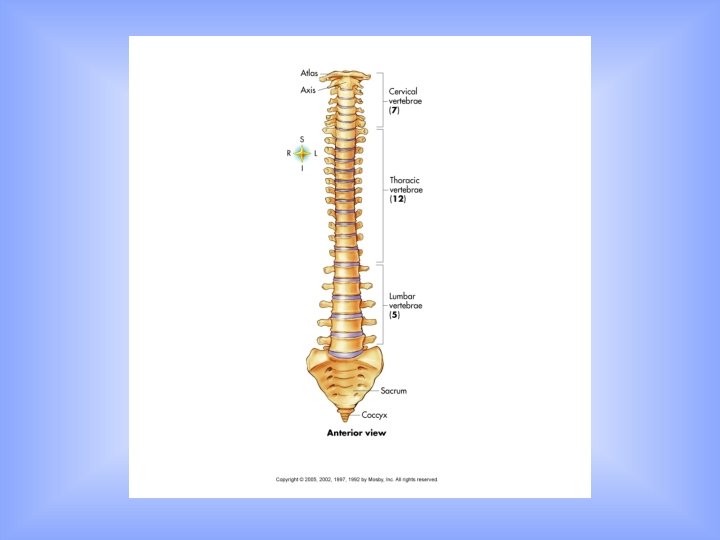 Axial Skeleton Sub-Divisions (continued) • Spine or vertebral column – Cervical (7 bones) – Thoracic (12 bones) – Lumbar (5 bones) – Sacrum (1 bone) – Coccyx (1 bone)