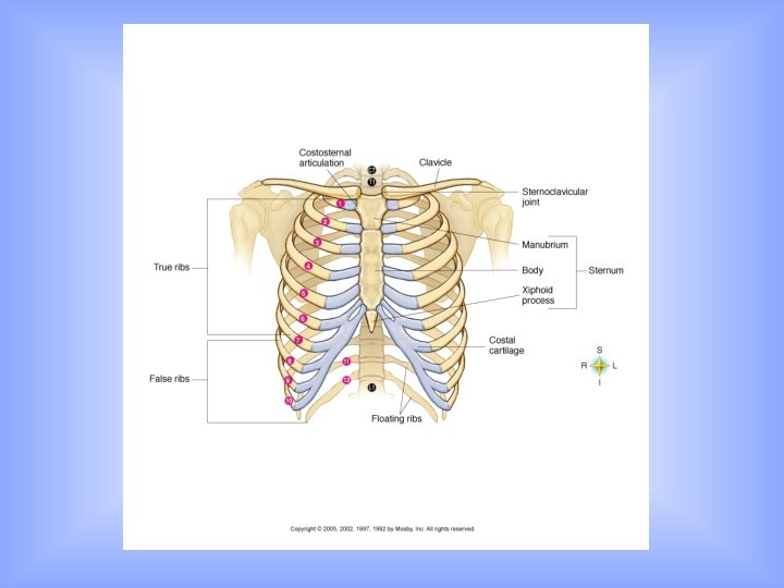 Axial Skeleton Sub-Divisions (continued) – Thorax • Composed of: – 12 pairs of ribs – Sternum or breastbone – Thoracic vertebrae • Ribs – True ribs—rib pairs 1 through 7 – False ribs—rib pairs 8 through 10 – Floating ribs—rib pairs 11 and 12