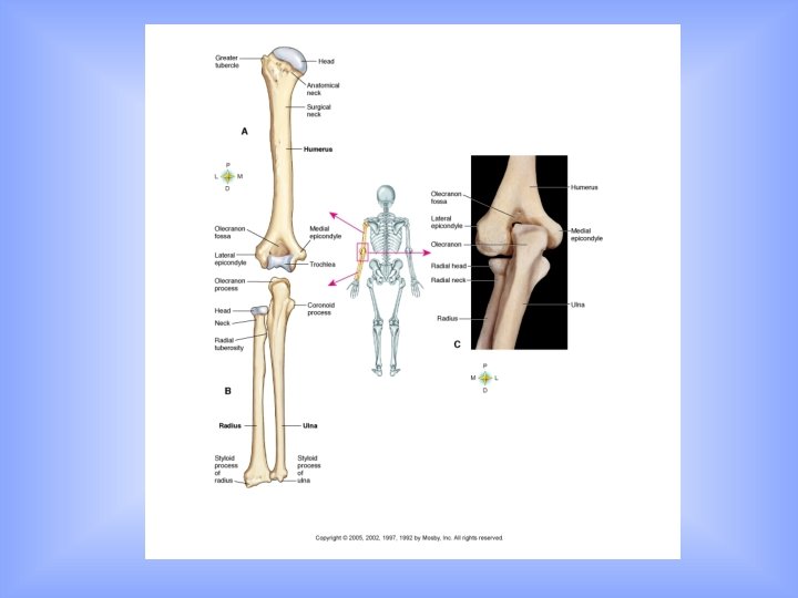 Sub-Divisions of Appendicular Skeleton – Upper extremity • Shoulder or pectoral girdle formed by: – Scapula – Clavicle (frequently fractured) • Arm—humerus • Forearm—radius and ulna • Wrist— 8 carpal bones • Hand— 5 metacarpal bones • Fingers— 14 phalanges or finger bones