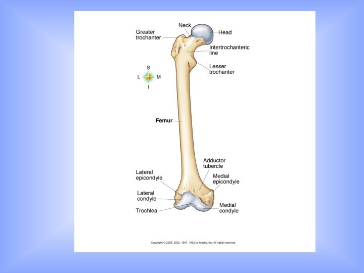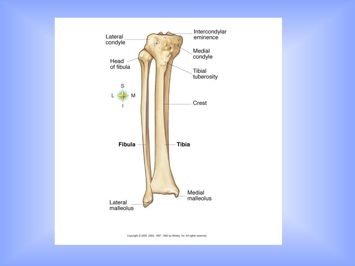 Sub-Divisions of Appendicular Skeleton – Lower extremity (continued) • Thigh bone—femur • Patella or knee cap articulates with femur and tibia • Lower leg—tibia (“shinbone”) and fibula