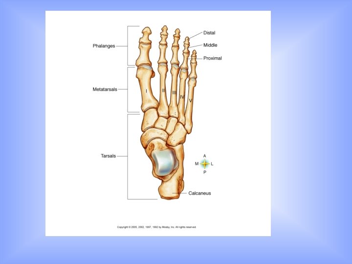 Sub-Divisions of Appendicular Skeleton – Foot • 5 metatarsal bones • 7 tarsal bones (calcaneus or heel bone is largest tarsal) • 14 phalanges or toe bones • 3 arches of foot—two longitudinal (medial and lateral) and a transverse or metatarsal arch— if weakened, result is “flat feet”