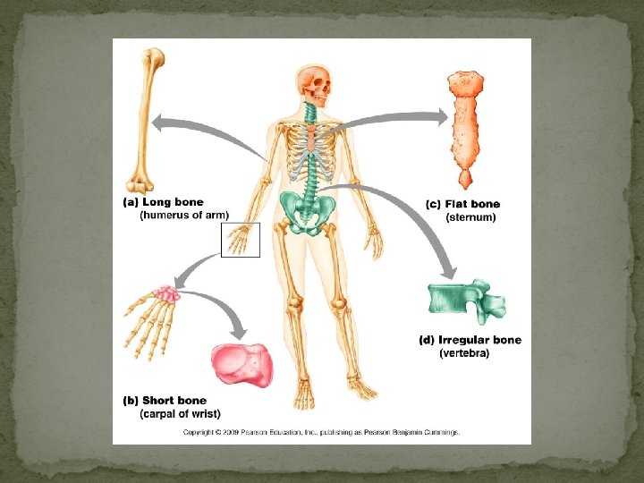 Classification of Bones Flat Bones �thin, flat bones with bit of a curve �sternum �scapula �ribs �most skull bones Irregular Bones �do not fit into other categories �vertebrae �hip bones