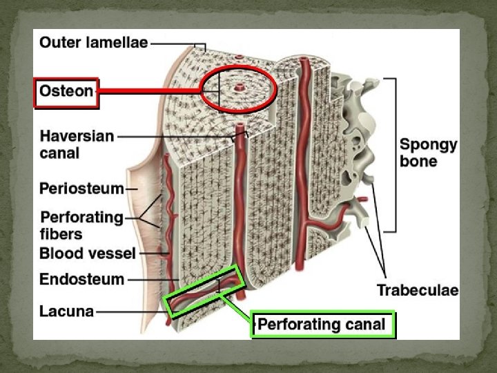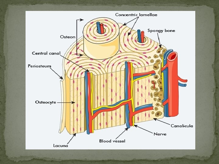 Parts of Compact Bone � OSTEON: �aka Haversian Systems �repeating units thru out compact bone �each one has central canal with concentrically arranged lamellae, lacunae (filled with 1 osteocyte) �aligned in same direction along lines of stress �space between osteon filled with interstial lamellae