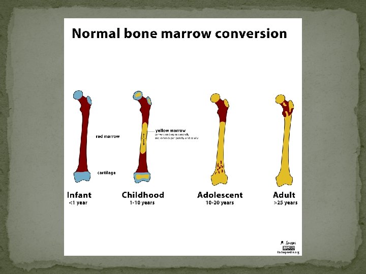 Hematopoietic Tissue in Bone �red bone marrow �found : �newborns: in all areas of spongy bone �adults: most long bones medullary cavity with yellow marrow (fat) extends through diaphysis � blood cell production only in head of femur & humerus � yellow marrow to hematopoietic marrow if person becomes very anemic and needs more blood cells than can make in head of femur & humerus