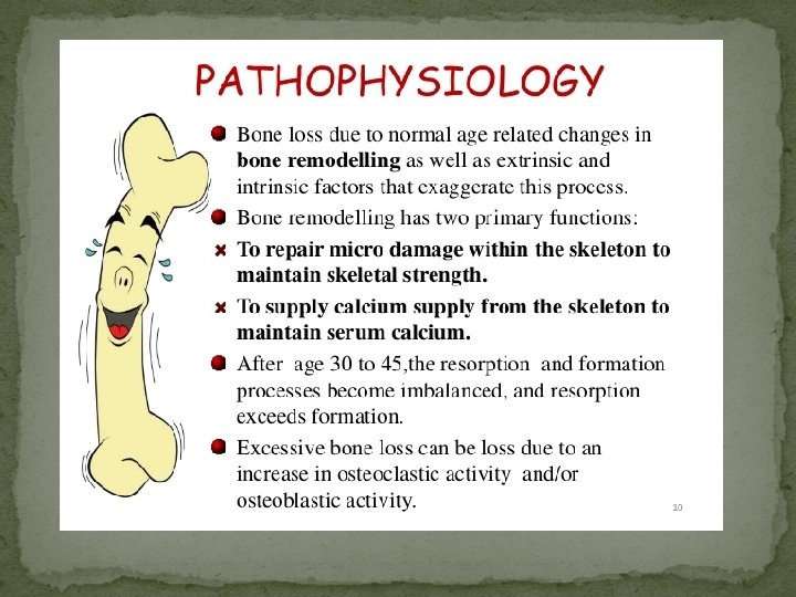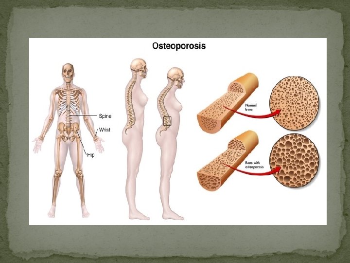 Homeostatic Imbalances in Bone 1. Osteoporosis � Condition of porous bones (resorption > deposition) � Causes: deficient Ca in diet � USA: > 1 million fractures (hip, wrist, vertebrae) & afflicts 30 million Americans � Decreased stature, hunched back, bone pain