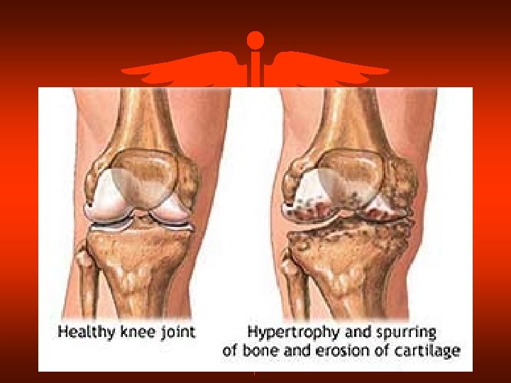 Osteoarthritis • • Degenerative joint disease associated with aging or with trauma Characteristics: – – – • degeneration of articular cartilage development of bone spurs usually effects large joints (knees, hips, etc) Treatment: – – – rest removal of bone spurs joint replacement
