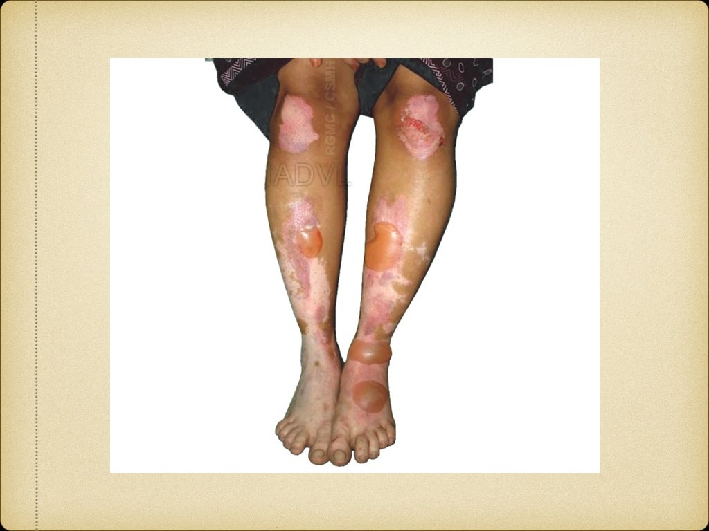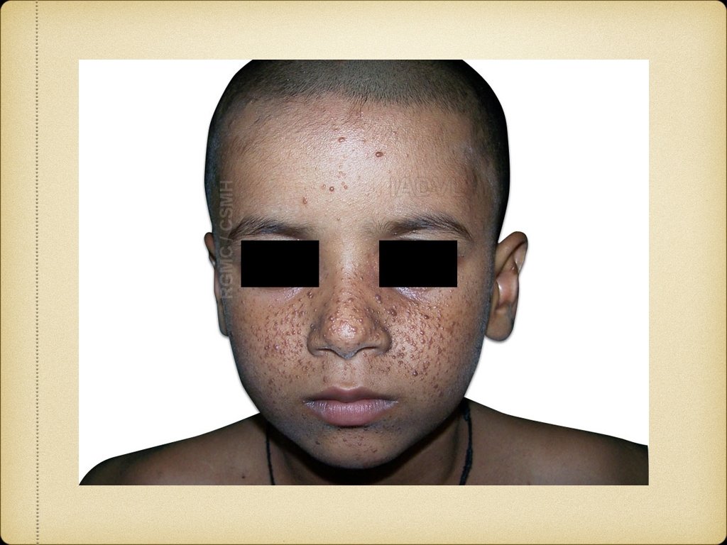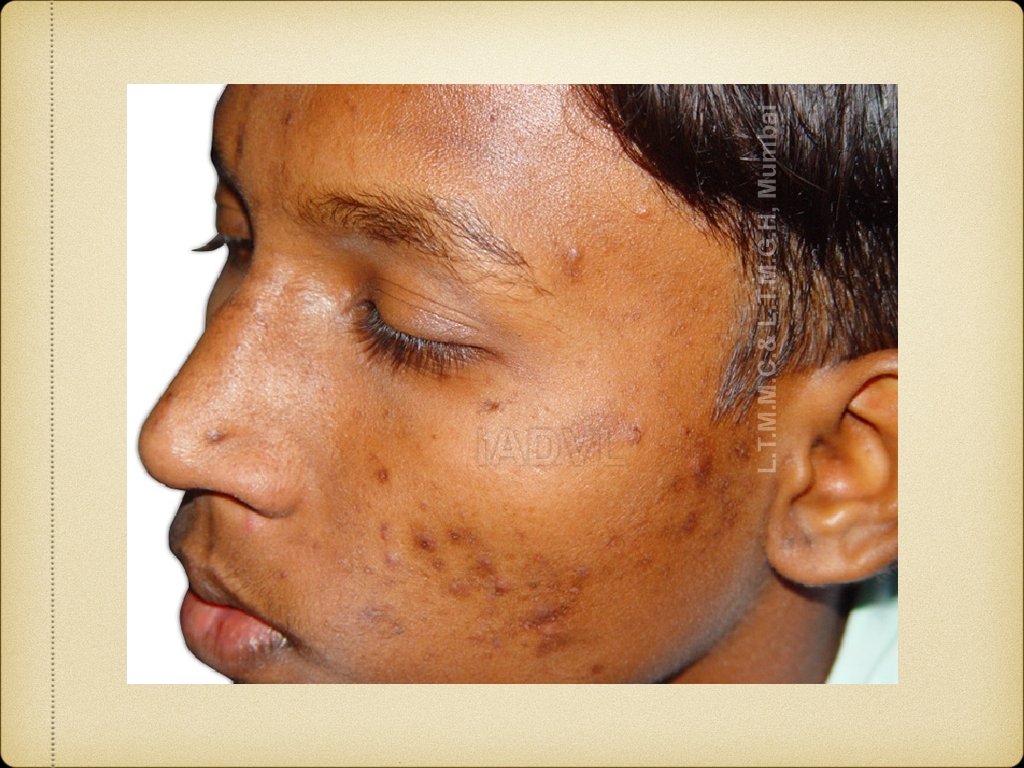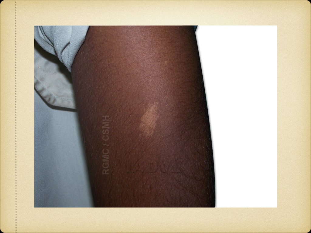 TUBEROUS SCLEROSIS Autosominal dominant, neurocutaneous syndrome Skin lesions, mental retardation and epilepsy Skin lesions are ash-leaf macules, angiofibromas and shagreen patches Ash-leaf macules - present at birth in>90% cases, so important in early diagnosis Oval or ash-leaf shaped, hypopigmented macules, made prominent in Wood’s lamp
