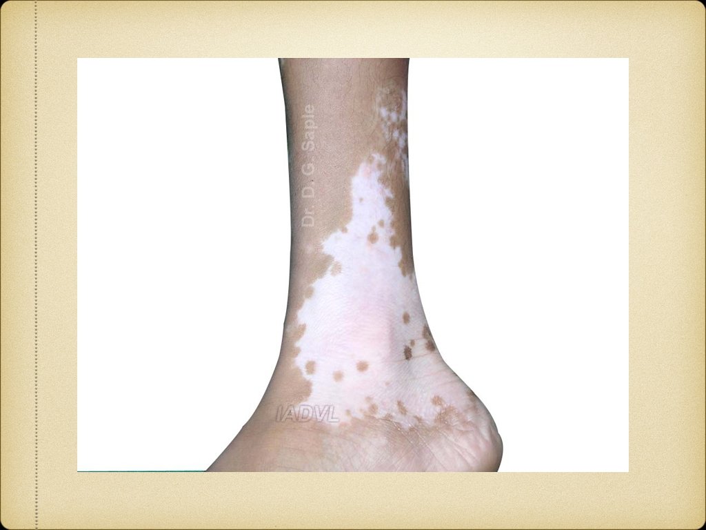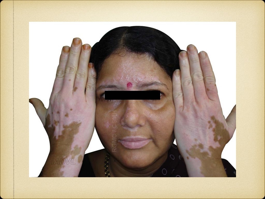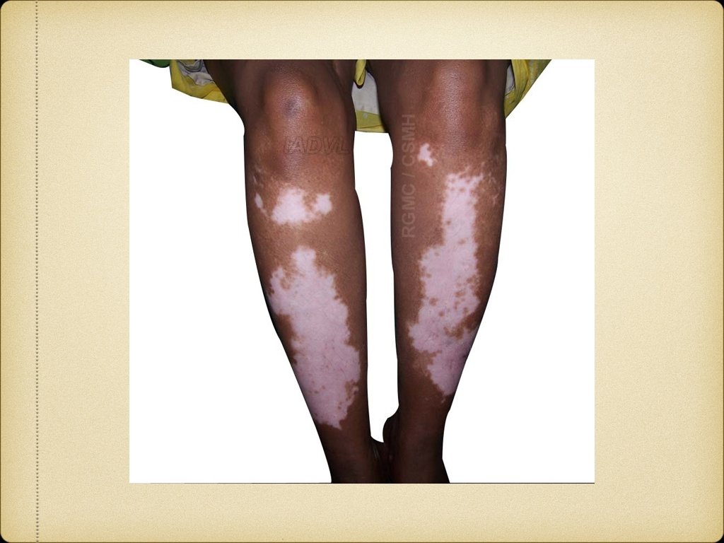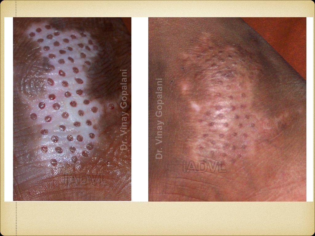 Management 1. Medical Topical agents: Steroids, tacrolimus, calcipotriol Systemic agents: Steroids, Azathioprine, Cyclosporine Phototherapy: PUVA, PUVAsol, NB-UVB 2. Surgical Tattooing, therapeutic wounding Grafting: Split thickness, punch, blister 3. Cosmetic camouflage 4. Destruction of hyperpigmented area