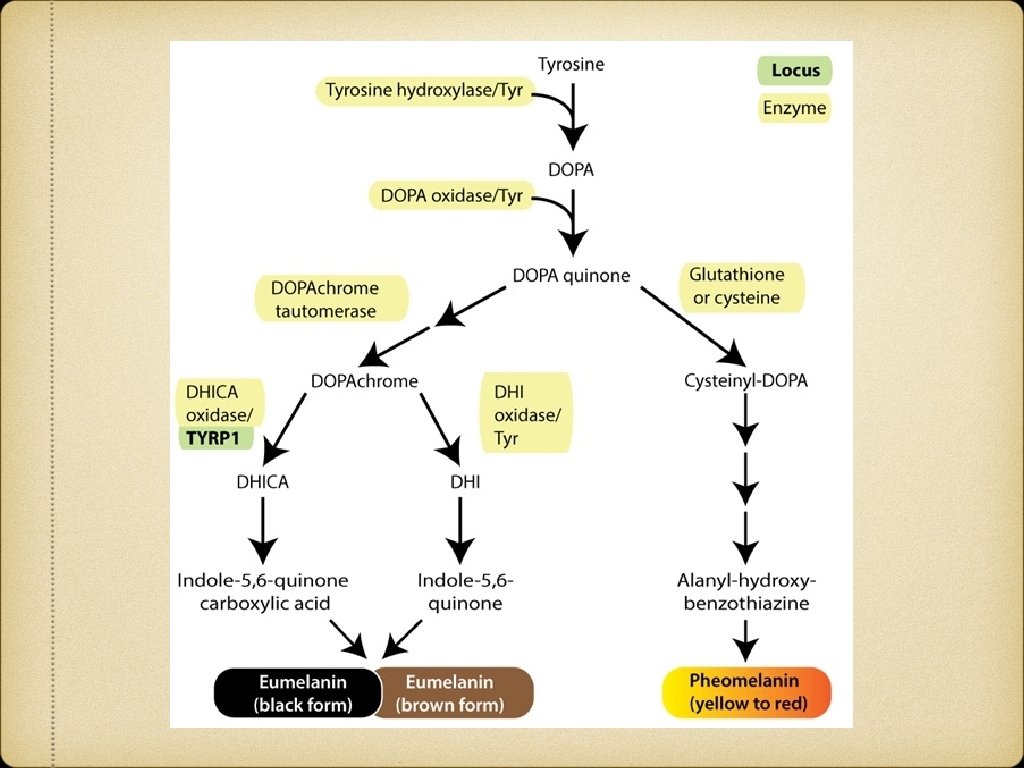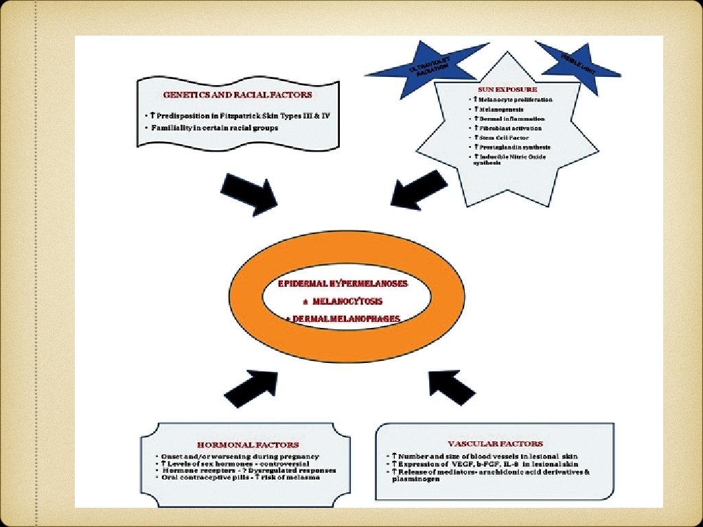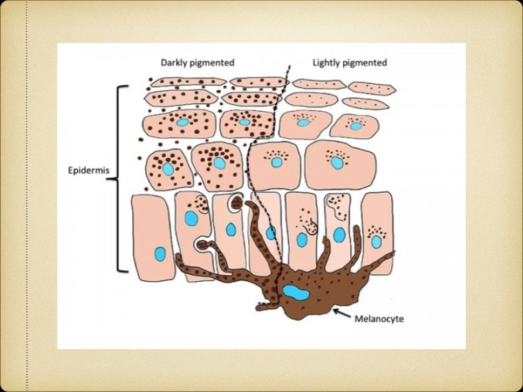 Epidermal pigmentation Physiological: Tanning Genetic & Developmental: Melanocytic nevus, Lentigines, Ephelides, Xerodermal pigementosum Post inflammatory: LP, Psoriasis Infection: P. versicolor Nutritional: Pellagra, Vit B 12 deficiency Endocrine: Addison’s disease, Melasma, Acromegaly Neoplastic: Melanoma, Pigmented BCC Physical: Trauma, Radiodermatitis