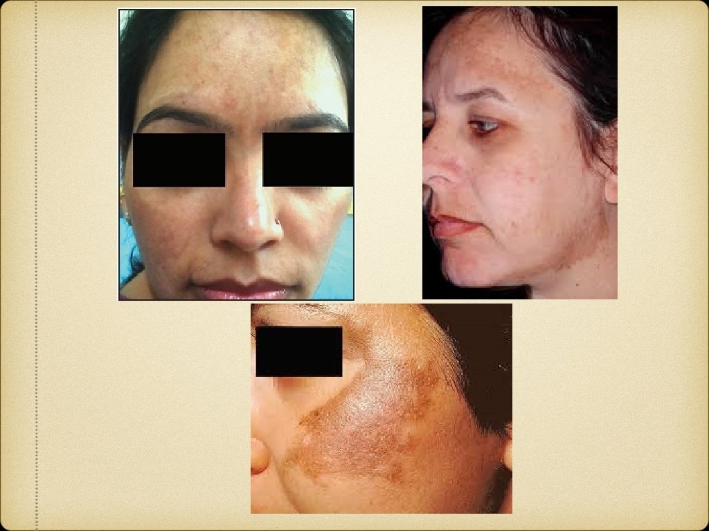 EPHELIDES (FRECKLES) Tiny (<0. 5 cm), discrete brown macules Common in fair skinned Appear in childhood on sun exposed parts; lighten in absence of sun exposure Melanocytes are not increased in number but are hyperactive