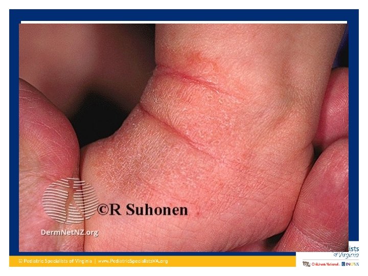 • • • Case: Julia 7 month old female Referred to clinic by PMD for evaluation of a rash and to find the cause, concerned it is a food allergy Rash started around 3 mo and has worsened over last 3 months Started on the cheeks initially but is spreading to trunk Seems uncomfortable and itchy Has been told not to bathe every day as this will make the skin worse