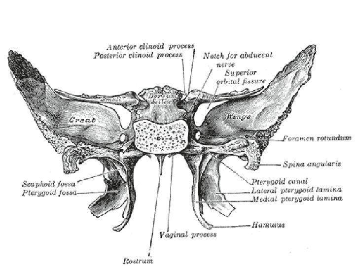 Sphenoid Bone • Spans width of middle cranial fossa • Articulates with all other cranial bones • Three parts greater wing, lesser wing and pterygoid processes • Sella turcica enclosure for pituitary gland