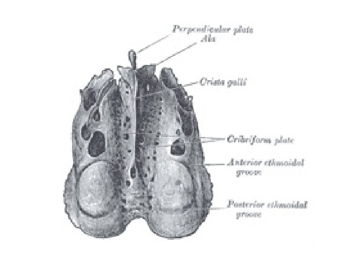 Ethmoid Bone • • Complex shape Nasal cavity and orbital cavity Cribriform plate roof of the nasal cavity Crista galli- outermost covering of the brain cover connects here