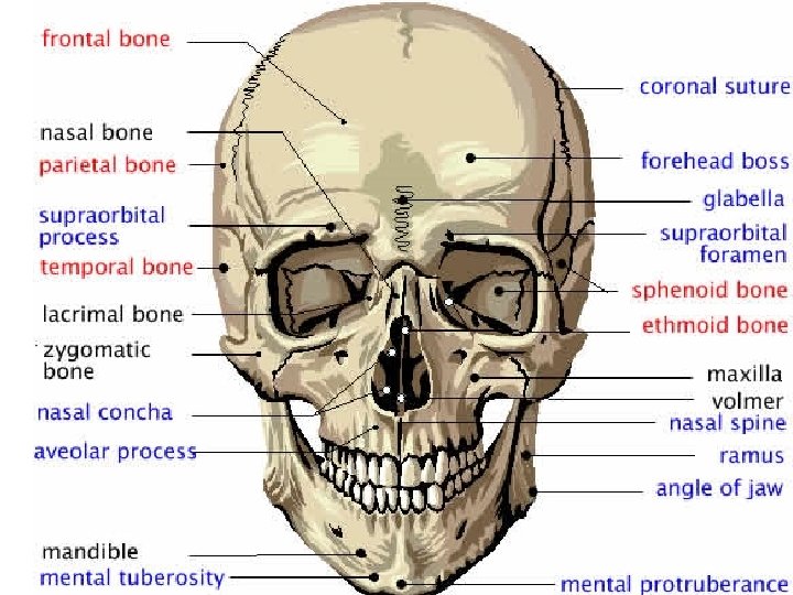 Functions of Facial Bones • 1. form framework of face • 2. contain cavities for special sense organs • 3. openings for food/air passage • 4. secure the teeth • 5. anchor the facial muscles of expression