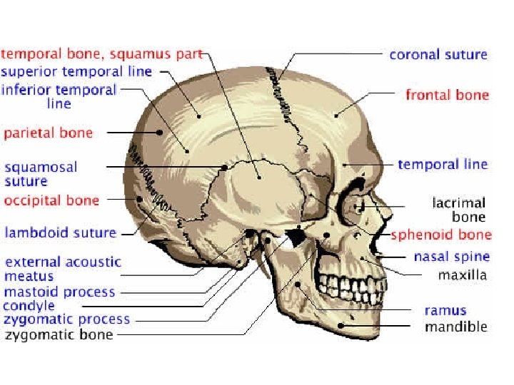 • ALL BONES OF THE SKULL ARE FIRMLY LOCKED IN PLACE BY JOINTS CALLED SUTURES • Four major sutures