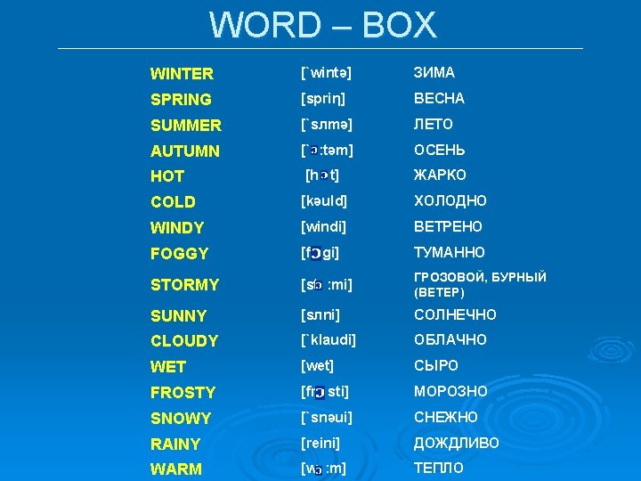 It is sunny and hot It is warm and wet. It is frosty and snowy It is rainy and cold I’ve finished