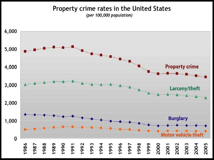 Types of Crime • Violent crimes: murder, forcible rape, robbery, aggravated assault • Crimes against property: burglary, larceny, motor vehicle theft, arson • Victimless crimes: prostitution, illegal gambling, illegal drug use, vagrancy • White-collar crime: Fraud, tax evasion, embezzlement, insider trading, forgery • Organized crime: “business” – drug