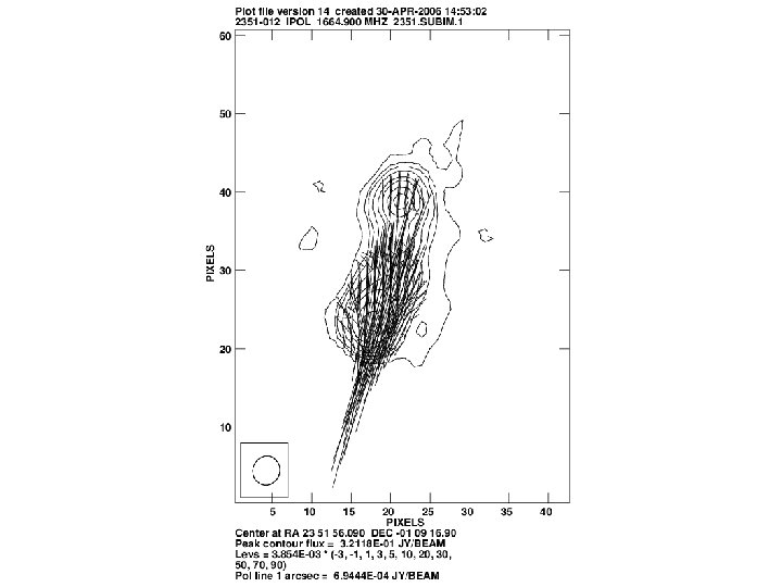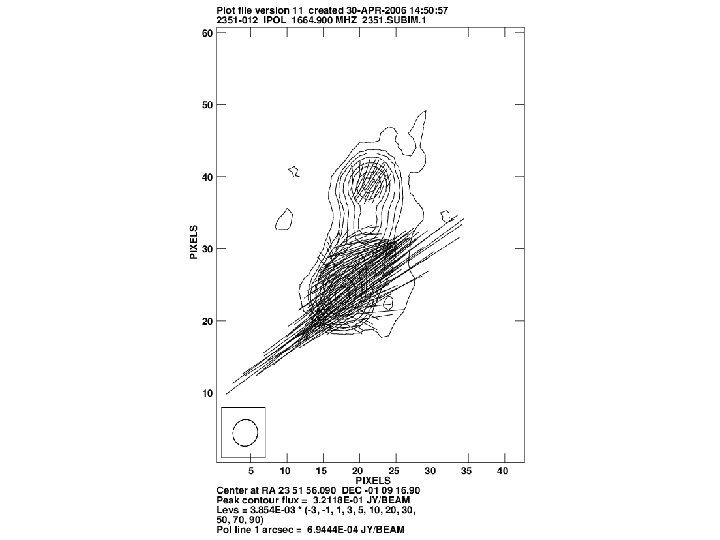 From The Astrophysical Journal 668(1): 520 -532. @ 2007 by The American Astronomical Society. For permission to reuse, contact journalpermissions@press. uchicago. edu. Ingleby, Spangler, Whiting 2007 Fig. 3. — Illustration of data used to obtain the coronal Faraday rotation for one of the lines of sight, that to 2325− 049 on March 12. In all three panels, the orientation and length of the plotted lines correspond to the polarization position angle and the polarized intensity, respectively, at that position in the source. The contours are of total intensity (Stokes parameter I). (a) The 1465 MHz polarization position angle map on March 12, when the line of sight passed through the corona. (b) Similar map of the source on May 29, when the corona was far from the source. (c) Position angle difference between the two maps, Δχ, which is the Faraday rotation due to the corona. For both components of the source, the Faraday rotation is 14°, corresponding to an RM of 6 rad m− 2. The resolution of all three maps is about 5 $arcsec$ (angular diameter FWHM of the restoring beam).