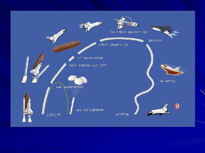 During re-entry the shuttle gets very hot – reaching temperatures up to 1500 o. C Thrusters reduce speed slightly from orbit speed of 28, 000 km/h Shuttle enters atmosphere inclined at 40 o to slow down – this is 120 km above Earth The shuttle flies in big S-shaped curves to slow down dramatically in the thicker air of the atmosphere 12 km from the runway and 3 km high, the shuttle deploys its flaps to slow from 682 km/h to 346 km/h A typical jet plane touches down at 260 km/h
