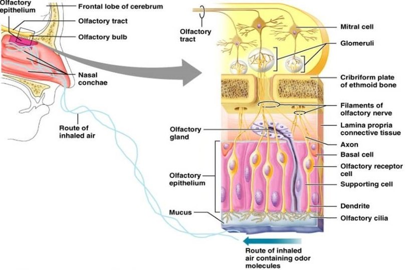 • Olfactory hairs on the ends of receptor cells are covered with mucous which serves as a solvent for odor molecules.