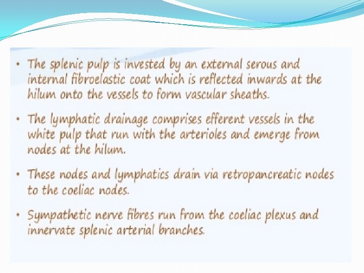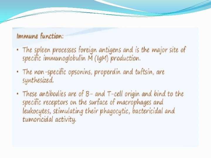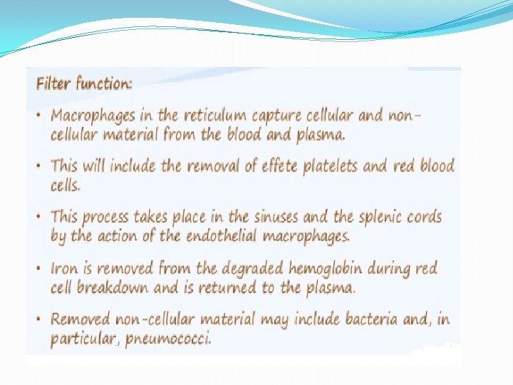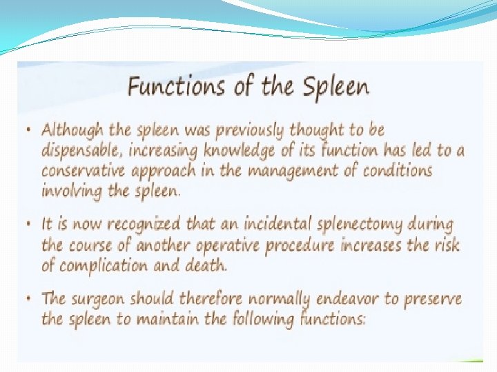 LEARNING OBJECTIVES � TO UNDERSTAND; � The function of the spleen � The common pathologies involving the spleen � The principles and potential complications of splenectomy � The potential advantages of laparoscopic splenectomy � The benefit of splenic conservation � The importance of prophylaxis against infection following splenectomy.