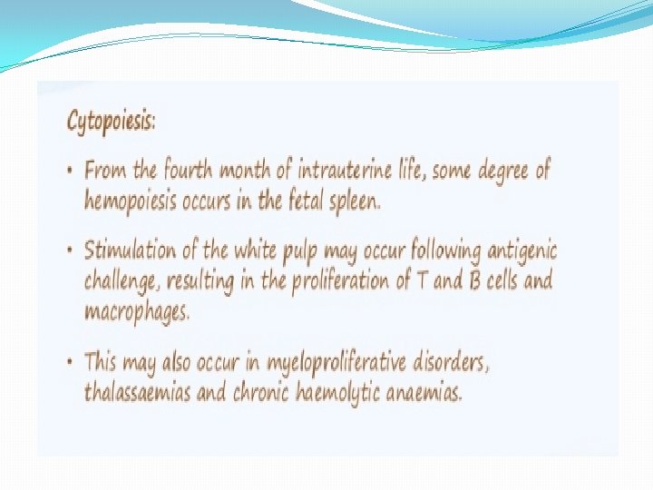 �Congenital anomalies of the spleen �SPLENIC AGENESIS; it is rare , about 10% of children with heart disease having such anomaly. �Splenunculi; single or multiple accessory spleen that are found in approximately 10 -30% of population they are located near the hilum of the spleen in 50% of cases, or along the vessels of the spleen, or tail of the pancreas in 30% � HAMARTOMA; it is rare , it is the size of 1 cm in diameter � NON parasitic splenic cyst; it is divided into primary(true) cyst , or secondary (pseudocyst)