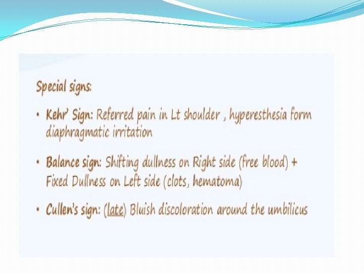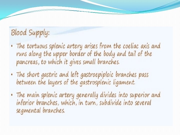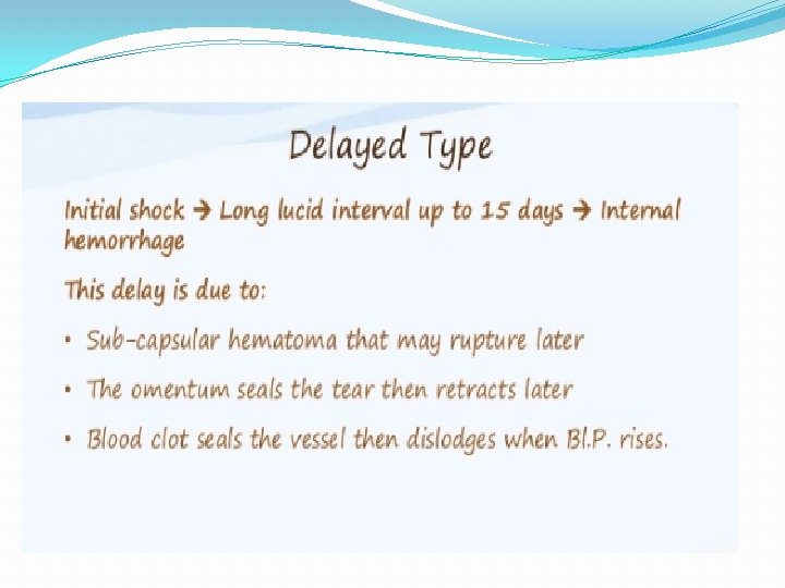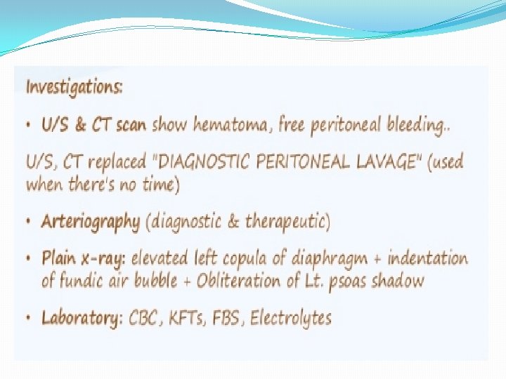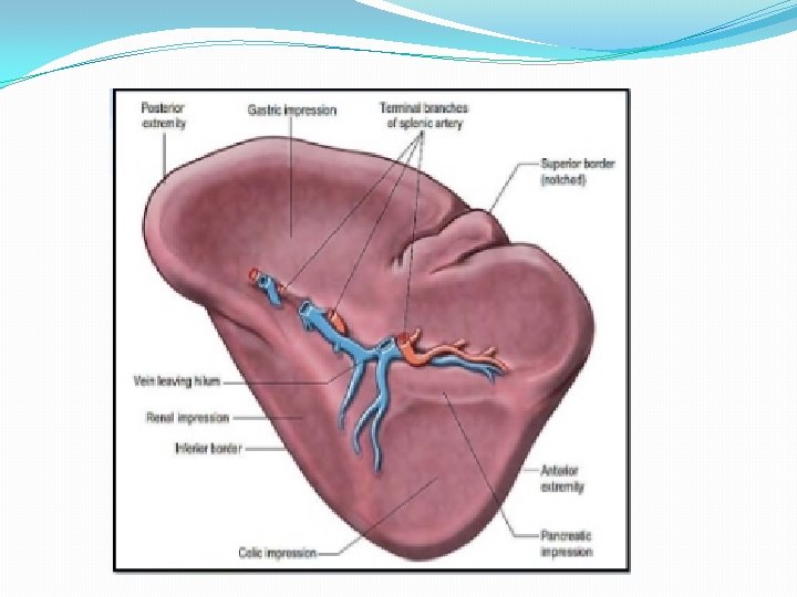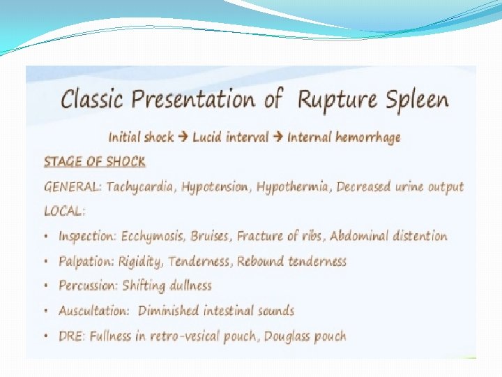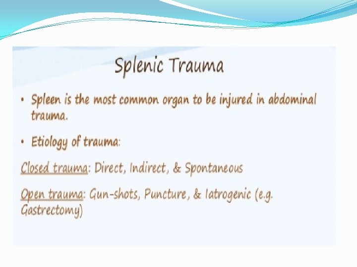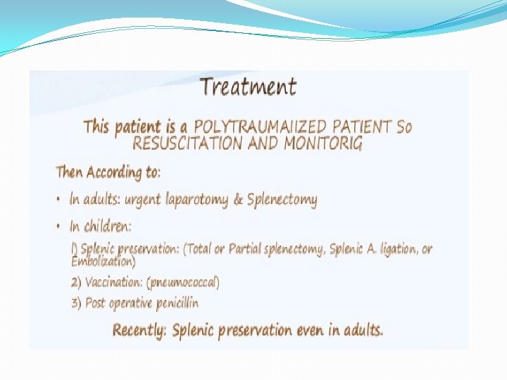 SPLENIC ARTERY ANEURYSM, INFARCT AND RUPUTRE � It is rare condition 0, 04 -1% found in post-mortem examinations , twice as common in female as in male , it is usually single but may be multiples. detected by plain x ray or scan of the abdomen , half of cases of rupture occur in patients around 45 years. � Treatment either splenectomy , ligation or embolization for artery disease , for splenic infarction treatment are splenectomy or conservative. Rupture treatment deepened on grade of laceration