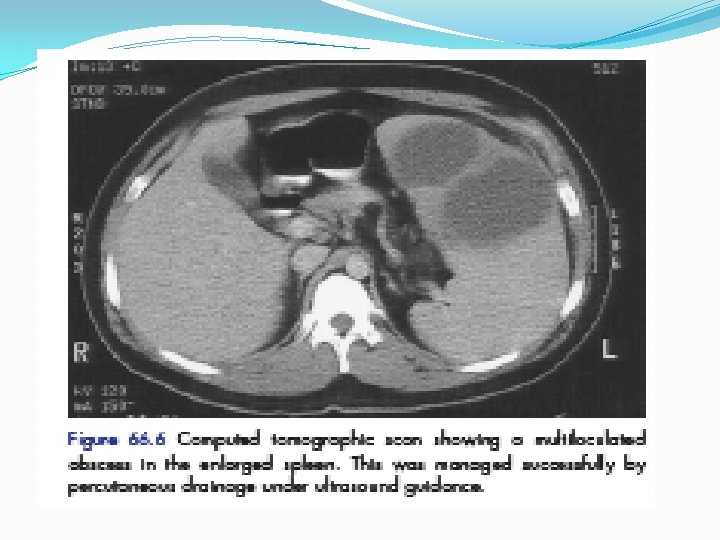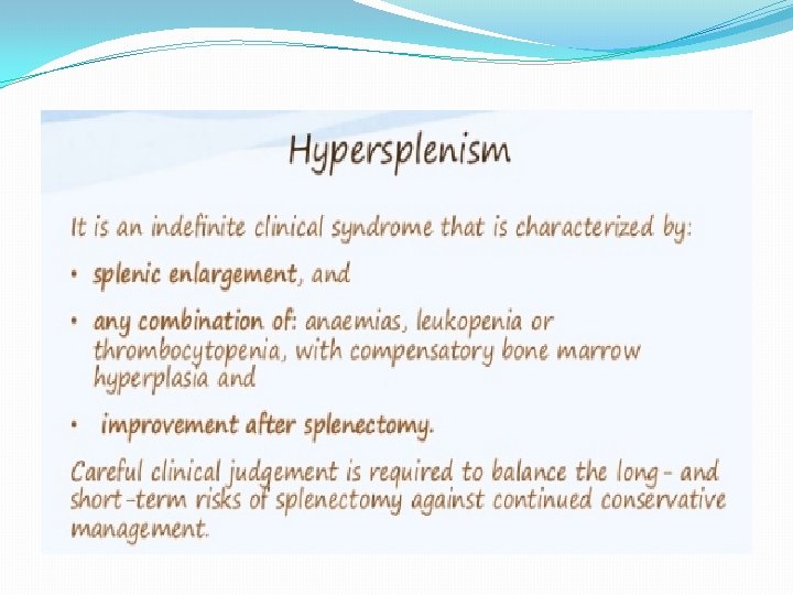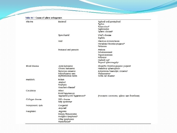 Splenomegaly and hypersplenism Infective BACTRIAL : Typhoid , PT Biogenic abscess VIRUS Spirochete s Parasite Bilharzia, Malaria Salazar Blood disease NEOPLA CONGES COLLAG TIVE STIC METABO EN POTAL LYMPHOMAP FELTY DISEAASE HYPERTENSION LIC Leukemia HEMANGIOMA Anemia Polycythemia SARCOMA ITP Hemolytic anemia GOUCHER DISEASA AMYLODOSIE RICKETS 9 TILL’S disease