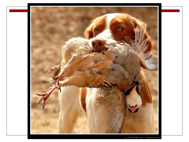 The “Flushers” n The Spaniels (Cocker, Brittany, Irish Water, Clumber, Springers, etc…) n Designed to find the game and flush it out of hiding so hunter can kill it.