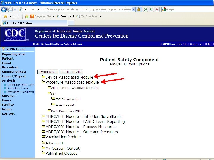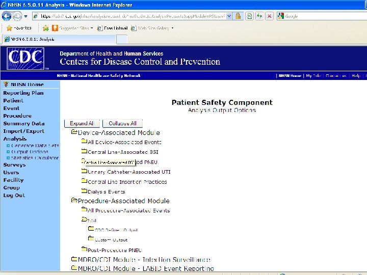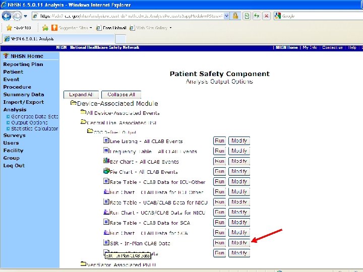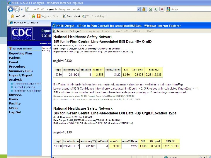 How to generate NHSN SIR outputs 1. Log into NHSN --> enter the Patient Safety Module 2. Starting from the blue navigation menu on the left, click “Analysis” --> “Generate Data Set” --> “Generate New” (note: this will take some time to load) 3. Click “Analysis” --> “Output Options” 4. On the white screen, click “Device-Associated Module” --> “Central Line-Associated BSI” --> “CDC Defined Output” --> “SIR – In-Plan CLAB Data” 5. Select “Run” for data aggregated by 6 -month intervals and CDC location type or select “Modify” to customize the output