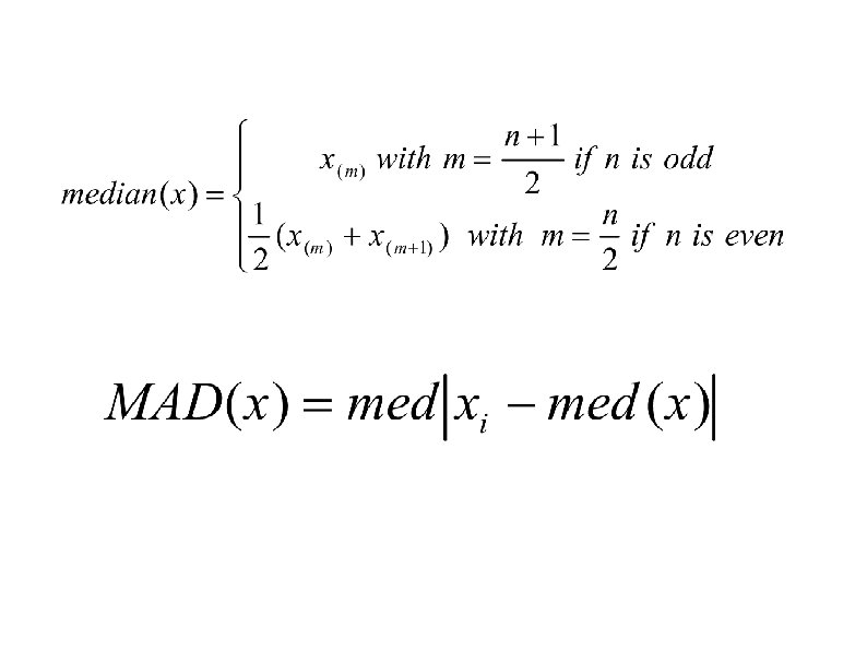 3. 2 Robust statistics “Robust”= insensive to extreme values Simplest robust measure of location: replace the mean by the median. To find the median of a set of numbers: sort them and pick the one in the middle Simplest robust measure of dispersion: replace the standard deviation by the median absolute deviation(MAD).