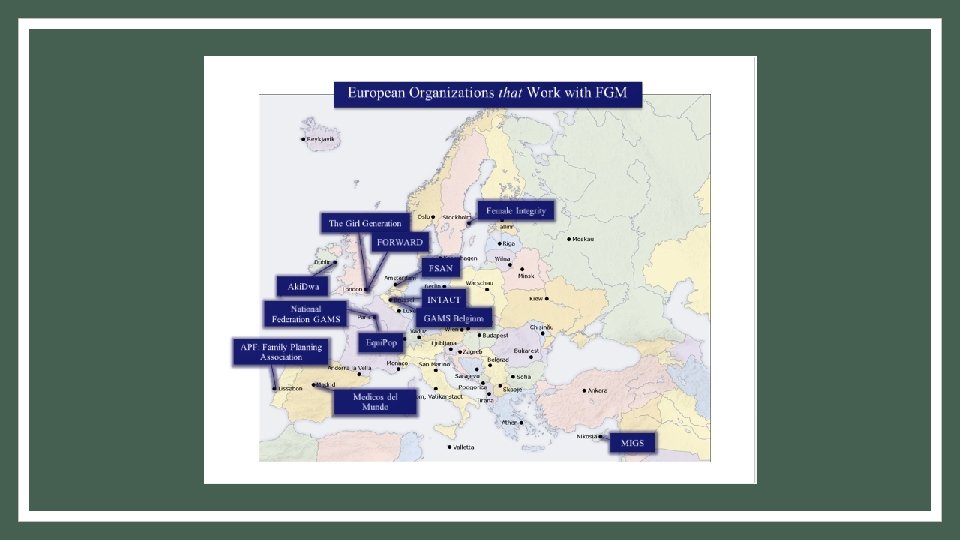 FGM & Migration • To date, there is no data collection which would allow for comparison and a European wide vision of the exact extent of the practice of FGM in Europe or of the number of women and girls living in Europe at risk of FGM. • According to a resolution passed by the European Parliament in March 2009 on Combating FGM in the EU around 500, 000 women and girls living in Europe have been subjected to female genital mutilation and 180, 000 are at risk for it each year. • More than half a million women and girls are at risk of undergoing or have already undergone FGM in the United States (Population Reference Bureau)