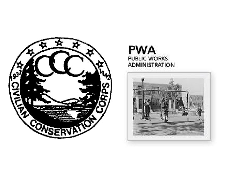 First New Deal cont. . Public Works Farm Programs • Public Works Administration (PWA)- the program built things like roads, bridges, schools, hospitals, and dams across the country • The Civilian Conservation Corps (CCC)- created jobs for many men like environmental projects. (National Parks) • Agricultural Adjustment Administration (AAA)- helped to improve farming practices, reduced farm production to raise prices, and gave a voice to farmers in the government