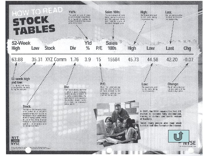 Steps to Buying/Selling Stock • • • Decide to Buy/Sell Stock Contact Broker Order sent to Booth at NYSE Order given to Floor Rep Trading Post Specialist Buy or Sell is carried out Price is adjusted Account is settled