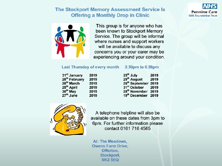 Post diagnostic groups (cont. ) • Living Well With Dementia Session(for carers) Followed by: Living Well With Dementia Drop In (carers) *New for 2019* • MAS Monthly Drop In Clinic (carers known to MAS) • As Dementia Progresses (course) • End of Life information session