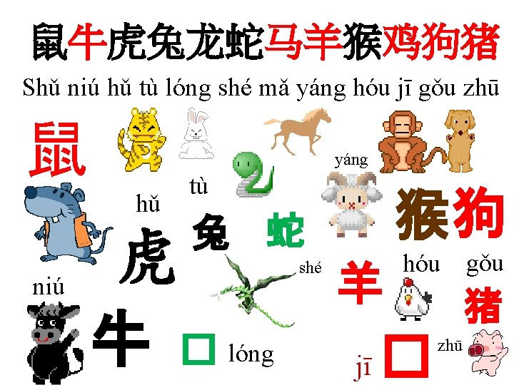 五 二 一 三 四 六 九 七 The race was over. The Jade Emperor at once announced the places of the twelve animals in the zodiac. 十 一 八 十 十 二