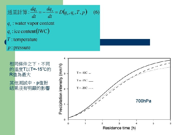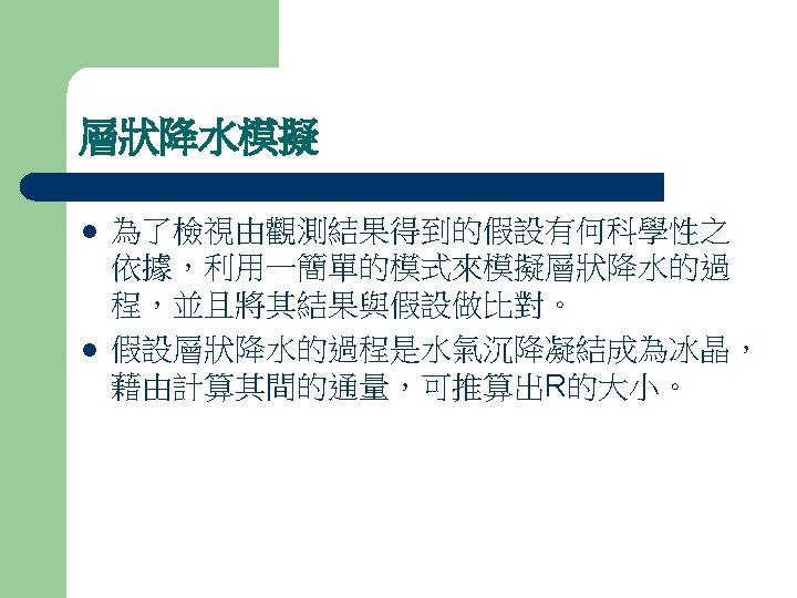 Stratiform precipitation model 基本假設: x-z plane U(horizontal air velocity)=10 m/s V(particals’ fall speed)=1 m/s Δt=6 h w(updraft intensity)<V