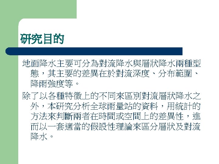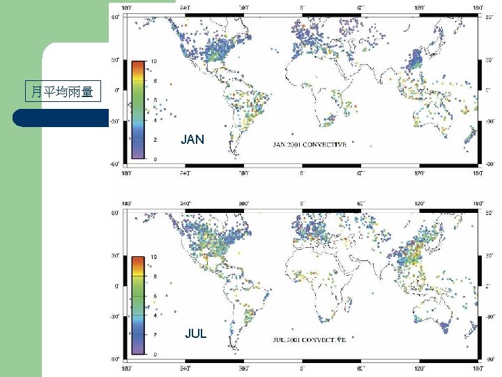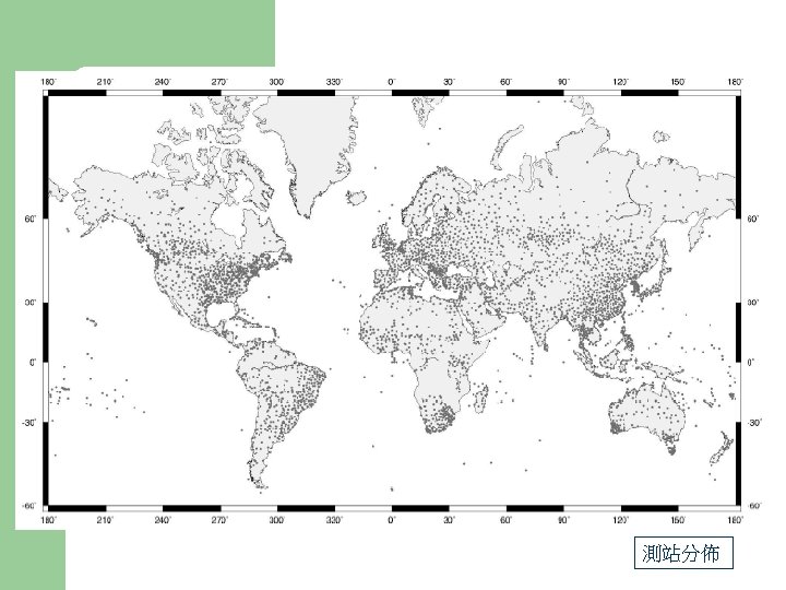 降雨資料分析 l l 來源: 2001 -WMO(World Meteorological Organization)surface rain gauge data 雨量紀錄門檻: 0. 1 mm(per 6 hour) 全球約3500個測站,每 6小時一筆資料 資料形式以R為單位(相當於precipitation intensity)