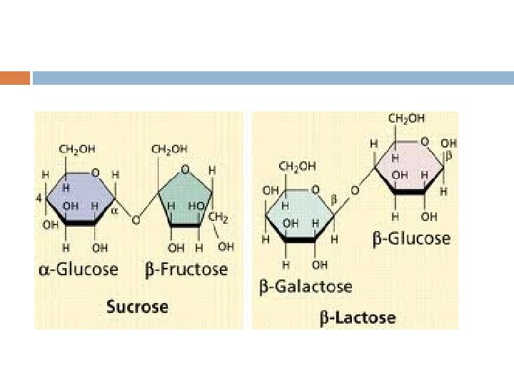 Disaccharides 2 glucose = maltose (malt sugar) glucose + galactose glucose + fructose = sucrose (table sugar) sucrose: form plants use to transport sugars from leaves roots & other nonphotosynthetic parts of plant