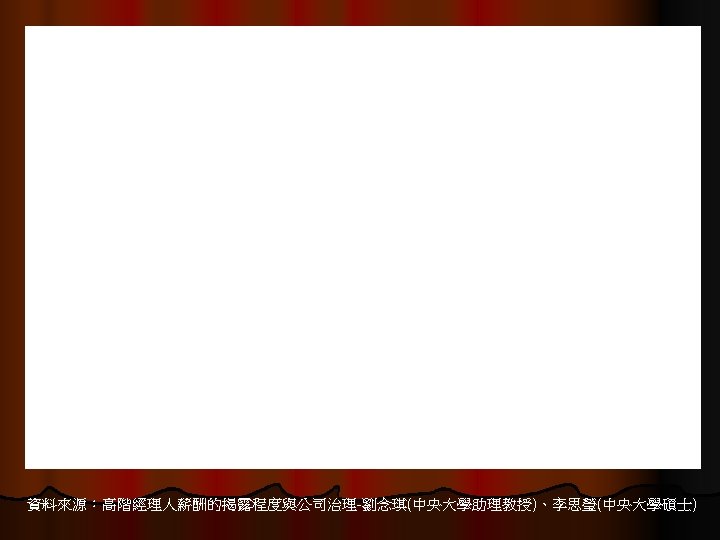 2) The Link between CEO Compensation and Firm Performance l In order to continuously elicit the correct incentive from the person who wins the tournament, the CEO’s compensation will have to be tied to the firm’s economic performance. The CEO would then be restrained from taking actions which reduce shareholder wealth. The empirical evidence indicates that there is indeed a positive correlation between firm performance and CEO compensation, although the elasticity of CEO pay with respect to the rate of return to shareholders is small.
