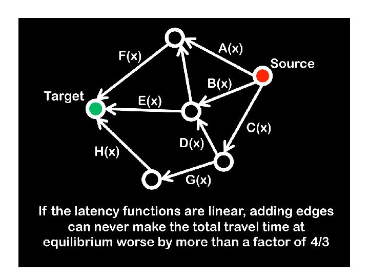 Braess‘s Paradox �Can improve analysis to show: ◦ Traffic at equilibrium is at most 33% worse than optimal