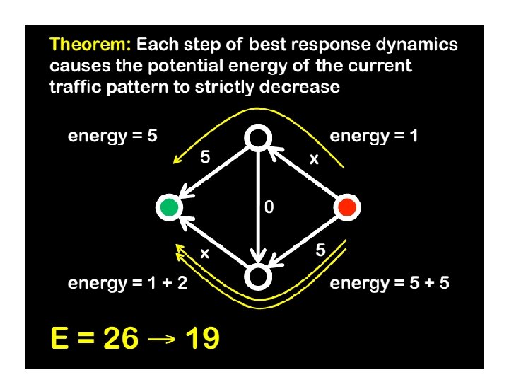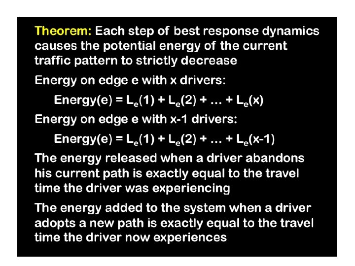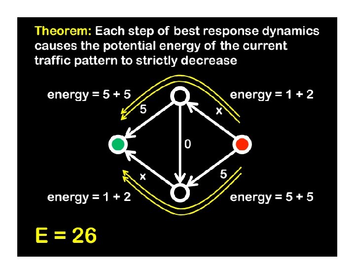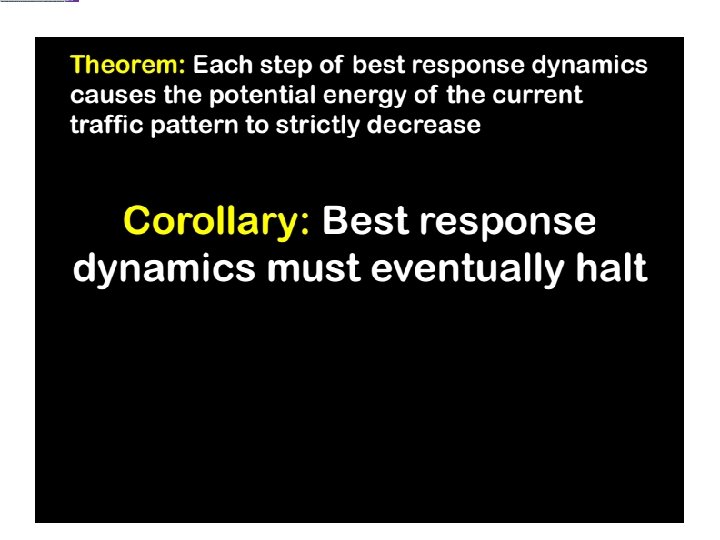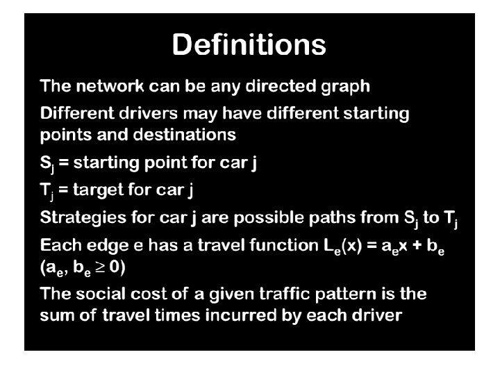 Another example �Dividing up equally is a Nash equilibrium ◦ No driver has an incentive to switch over to the other route �This is the only Nash equilibrium ◦ Consider strategy where x drivers use upper route, and 4000 -x use lower route ◦ If x is not 2000, then routes will have unequal travel time ◦ Thus users of slower route will want to switch to the faster route �Therefore, x ≠ 2000 can‘t be a Nash equilibrium
