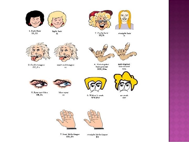 Genotype = an organisms’ allele combination for a particular trait Phenotype = the organisms visible appearance (WHAT YOU ACTUALLY SEE!) Example: Gene/trait: Widows peak Alleles: Widows peak – dominant – W No widows peak – recessive – w Genotype: Ww Phenotype: Widows peak