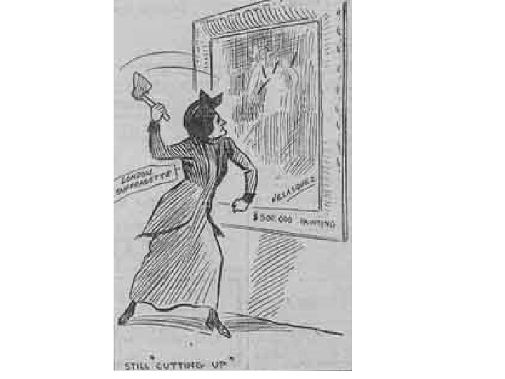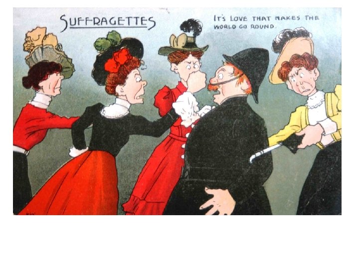 The Reaction to the Suffragettes • Many men opposed women getting the vote; • In 1875, a ‘Committee for Maintaining the Integrity of the Franchise’ had been formed in Parliament, which was made up of MPs who did not want women to be able to vote; • These men deliberately “talked out” bills presented in Parliament, to give women the vote; • The violent action of the Suffragettes turned many more men and some women against the issue of votes for women; • Once you have Suffragettes smashing windows, and burning down churches and attacking works of art, people who had no real opinion on the issue of votes for women turned against them, which is, perhaps, not surprising; • Posters ridiculing the Suffragettes were made.
