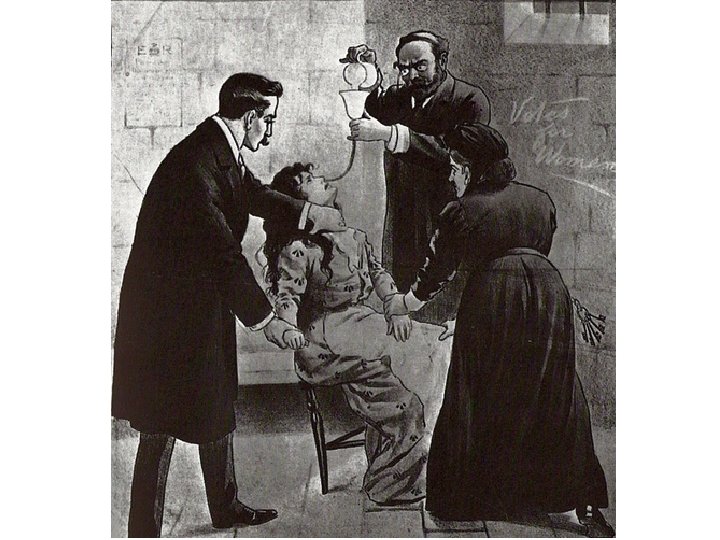 What happened to the Suffragettes who were arrested? • They claimed that they were political prisoners and so should be given special rights, as laid down by the law; • The Prison system treated them as common criminals and so the women started to go on hunger strike; • At first, when the women became weak they were released, then the government introduced force-feeding!