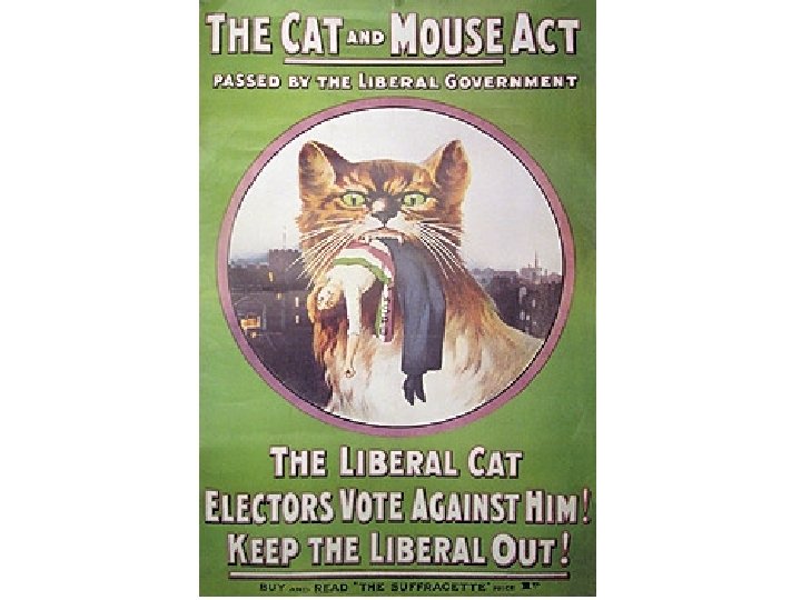 The Cat and Mouse Act, 1913 • In 1913, as a response to all the criticism of force-feeding, the government introduced a new act; • This Suffragettes on hunger-strike, had to be released when they became ill. Then, when they had eaten and recovered, they were to be arrested again, to finish of their sentence. • This Act (1913) was nicknamed the ‘Cat and Mouse Act’.