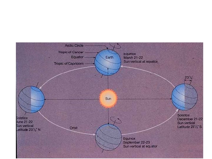 The sun • Due to the earth’s tilt and its orbit around the sun, the declination of the sun changes with time of year 23. 45 o at summer solstice (21 June) 0 o at vernal and autumnal equniox (21 Mar, Sept) -23. 45 o at winter solstice (21 Dec) The sun looks like a “star” that changes declination, but also moves through the background of fixed stars over the course of the year.