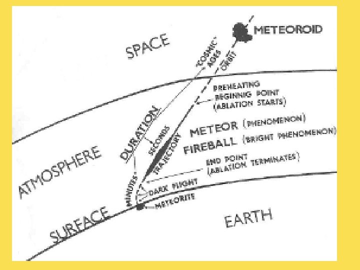 A meteoroid is debris located outside of Earth’s atmosphere that orbits the sun. • A meteor is debris located within Earth’s atmosphere that vaporizes…known as a shooting star. • A meteorite is a meteoroid that survives its passage through Earth’s atmosphere and hits Earth’s surface.
